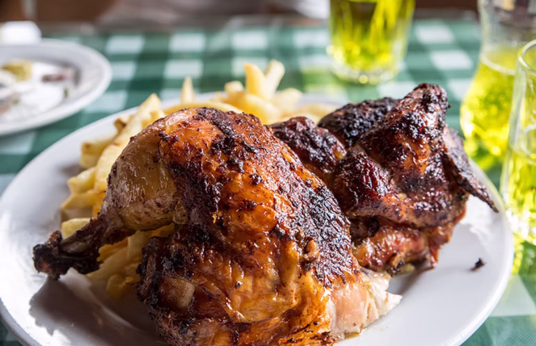 3. To the bottom bun add salad, 1 grilled beef burger, 1 tablespoon Cuban Chimichurri, 1 cheese slice, 2 pieces thin sliced chorizo, 2 slices gherkins and 1 teaspoon mustard.